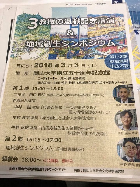 13時から、「岡山大学創立50周年記念館」で開催された『3教授の退職記念講演&地域創生シンポジュウム』に出席しました。岡山大学大学院地域公共政策コース在学中にお世話になった先生方です。中村誠教授、ありがとうございました。平野正樹教授、ありがとうございました。そして修士論文をご指導いただきました中村良平教授、ありがとうございました。