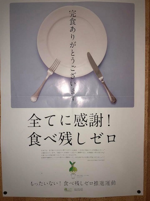 福島市内で何度か拝見しました。岡山県も『3010運動』を推進していますが、福島県の『食べ残しゼロ推進運動』のポスターです。