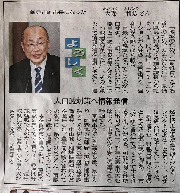 もうすっかり「新見の顔」だ。いい滑り出した。「よろしく」は山陽新聞です。
