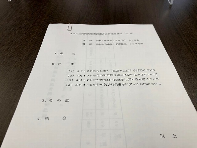 9時30分から、「自民党支部連合会常任総務会」。市長、町長選挙の推薦について。10時から、「2月定例岡山県議会」再開。代表質問。昼休憩時間に「政友会」。