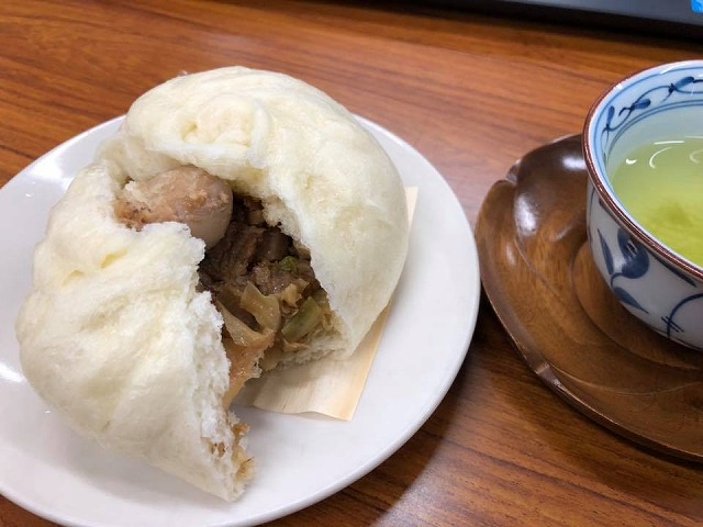 昼時間となりました。お腹もすいてまいりました。豚まん!だってねぇ。ウズラの卵入り!だってねぇ。山珍!だってねぇ。さあ、食いねぇ!ってわけで、いただきます。