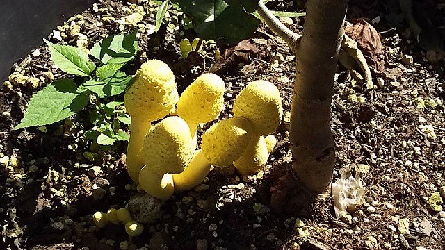 鉢植えのサクランボの根元にキノコが顔を出していた。名前は「コガネキヌカラカサタケ」というそうだ。「本州でも見られるが自生はせず、熱帯地方から持ち込まれた腐葉土に混ざった菌から発生することが多い」とのことだ。