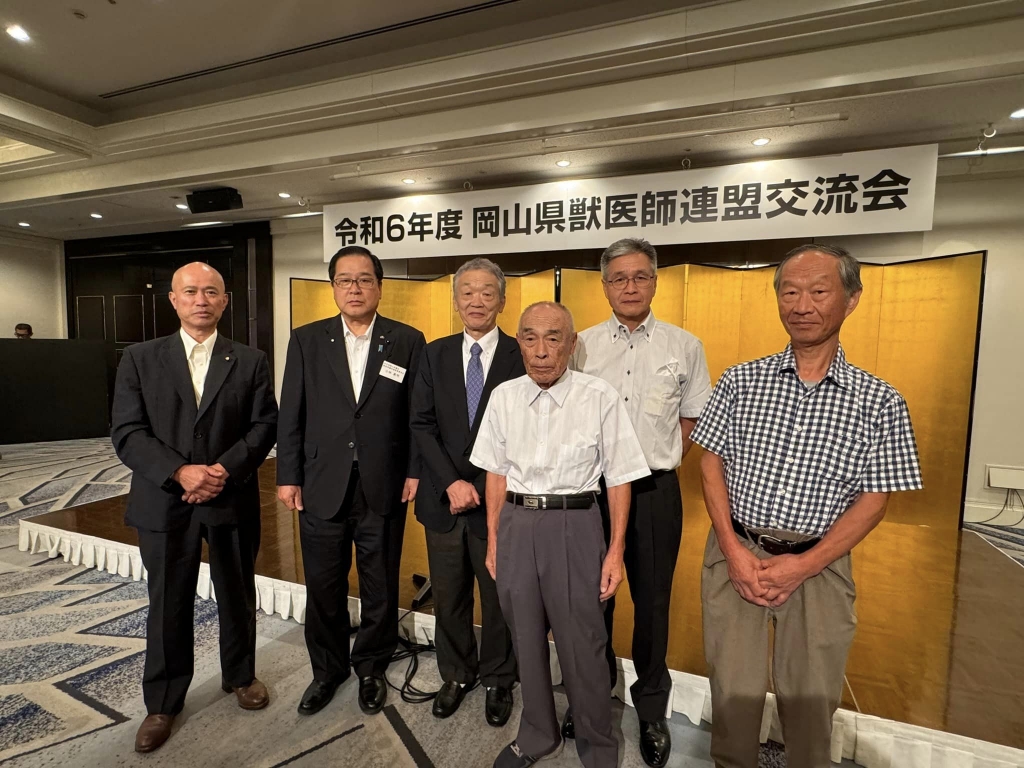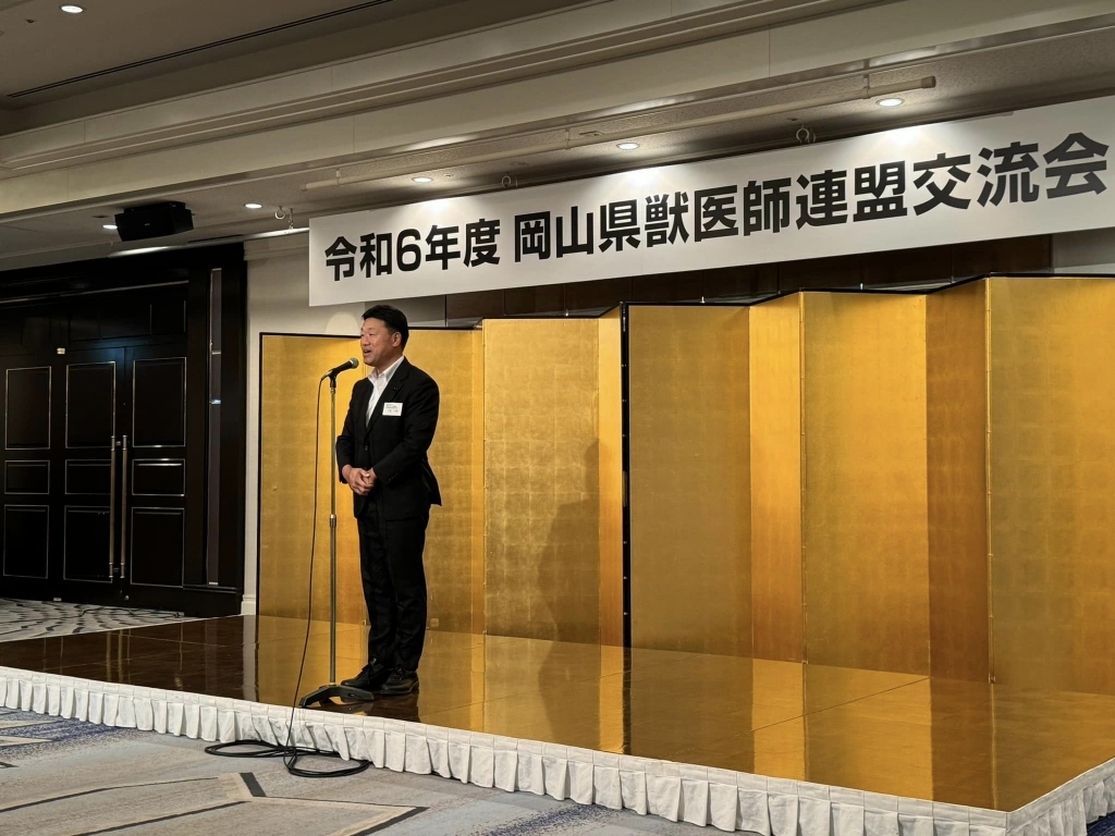 17時から、岡山市内のホテルで開催された「令和6年度岡山県獣医師連盟交流会」に出席しました。この会は、岡山県獣医師連盟の皆様と県議会獣医師議員連盟(久徳大輔会長)の議員との意見交換・交流を目的として、開催されました。私は同議連の事務局長としてご紹介をして頂きました。