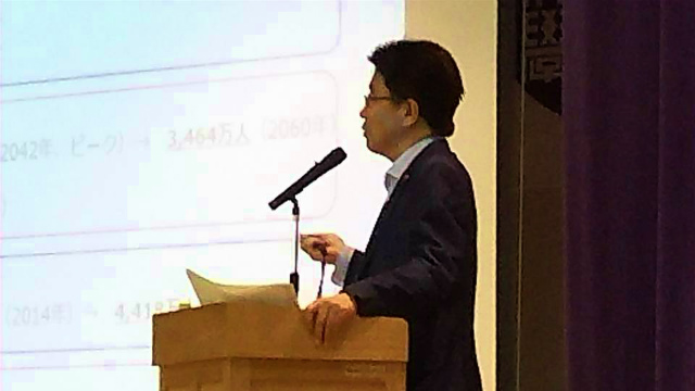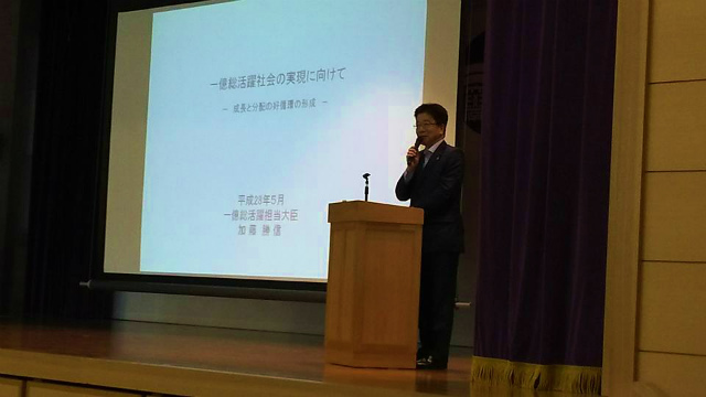 続いて、「新見公立大学体育館」で開催された『地方創生にいみカレッジ「鳴滝塾」特別講演会』に出席しました。講師は、加藤勝信大臣。テーマは『一億総活躍社会と地方創生』です。その後、学生たちとの座談会がありました。