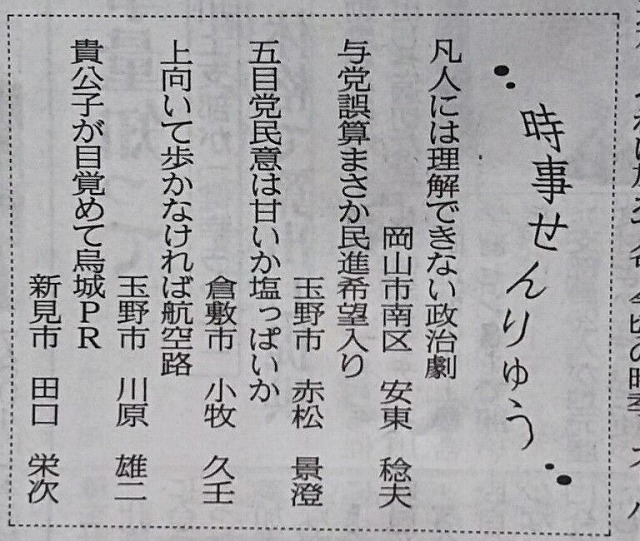 117回目の掲載です。山陽新聞「時事せんりゅう」は、田口栄次くんであります。
