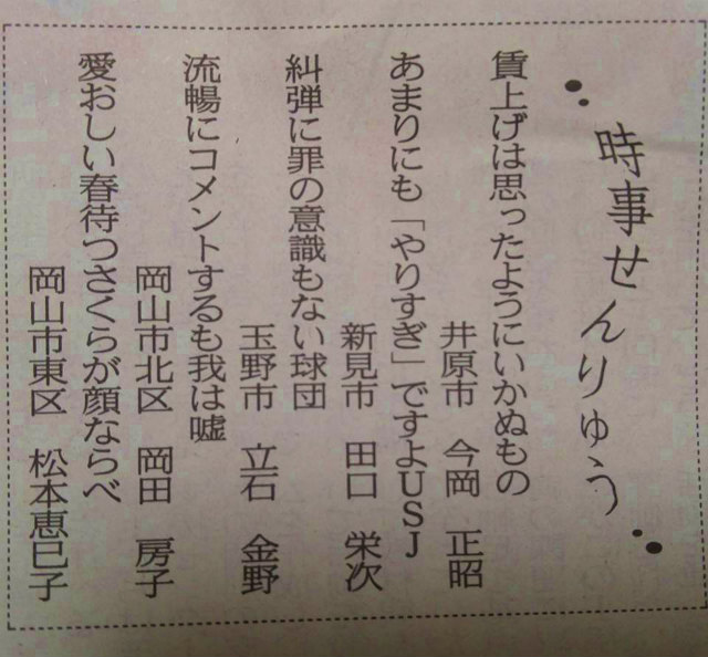 同級生の田口栄次くん、104回目の「山陽新聞時事せんりゅう」掲載です。おめでとうございます。素晴らしい。