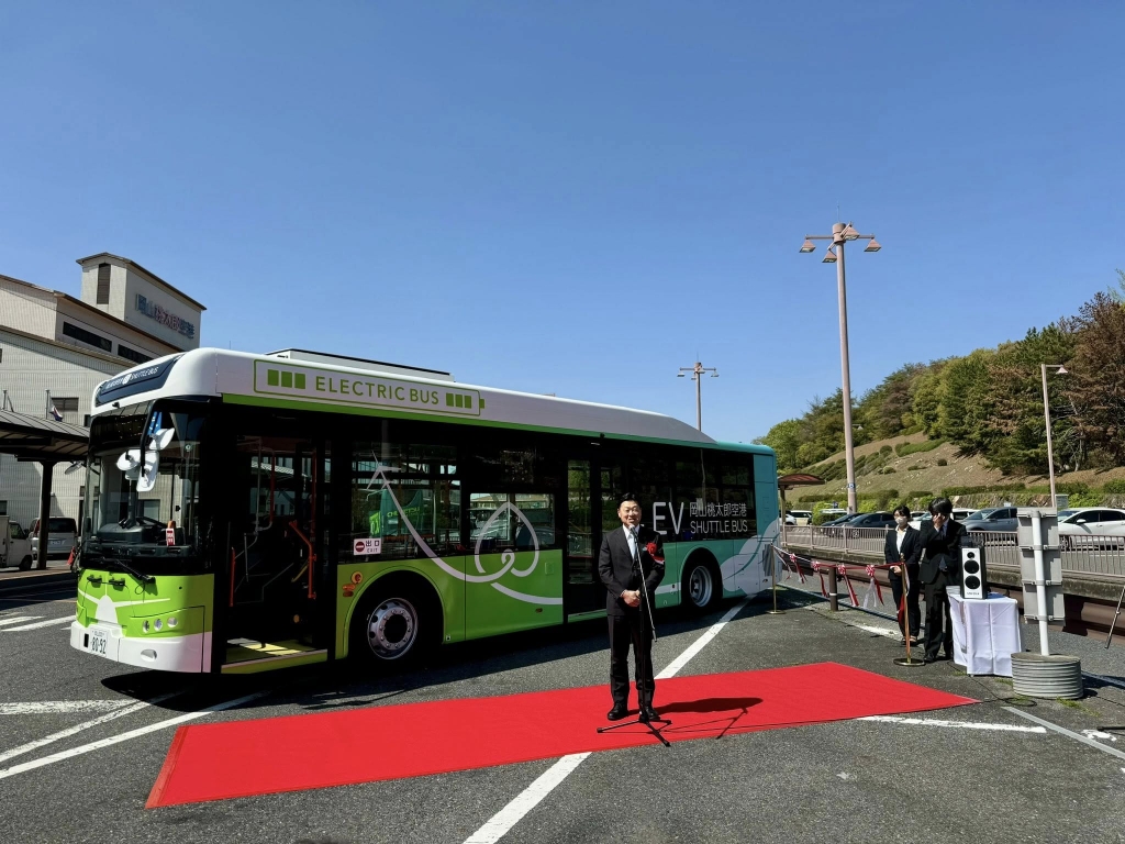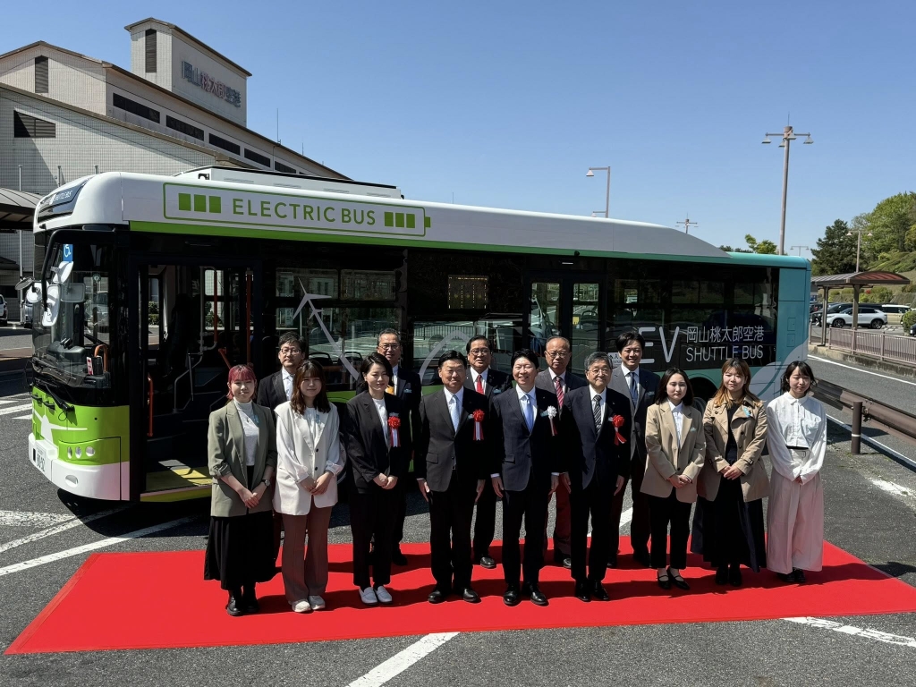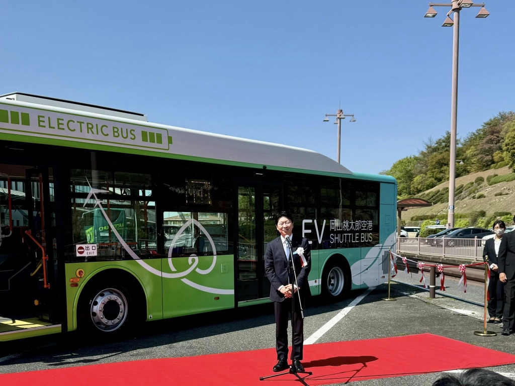 岡山桃太郎空港に導入された無料EVシャトルバスのお披露目式に出席しました。車体のデザインは県立大学の皆さん。23日から運行されます。日本晴れだなぁ。