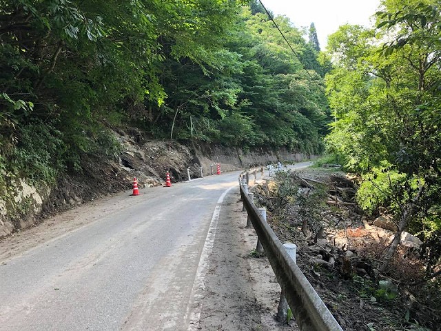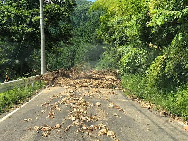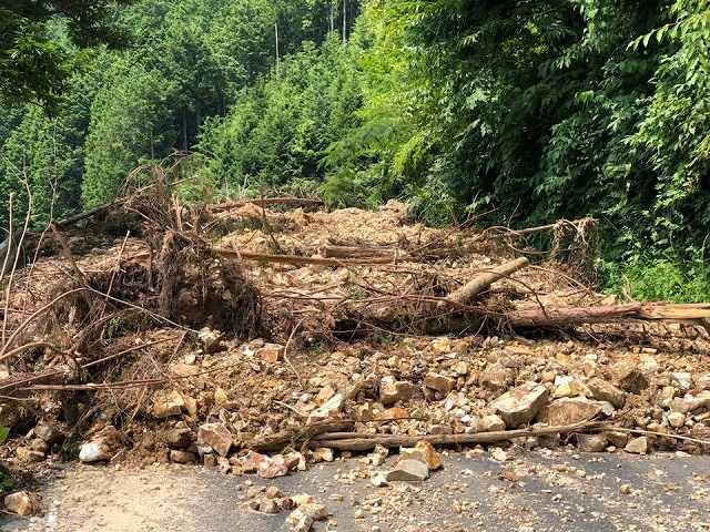 続いて、君山・大井野地区に入りました。大井野下組から赤松へ抜ける道へ土砂が流れ出ていました。