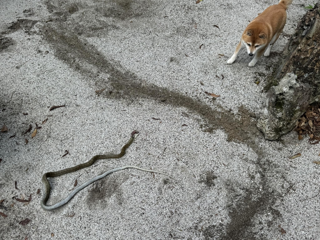 「草刈り」を終えて、「ふく」の散歩に出かけようとしたら、庭に大きなヘビ。危険な奴だ。「この線から入っちゃ駄目だよ」