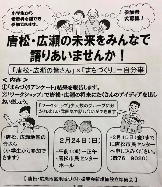 急いで、住まいする唐松の「唐松市民センター」に戻って、10時から開催されている『唐松・広瀬の未来を語る会(主催:唐松・広瀬地区地域づくり・振興会新組織設立準備会)』に遅れて出席しました。が松・広瀬地区まちづくりアンケートをもとに、ワークショップが開かれています。