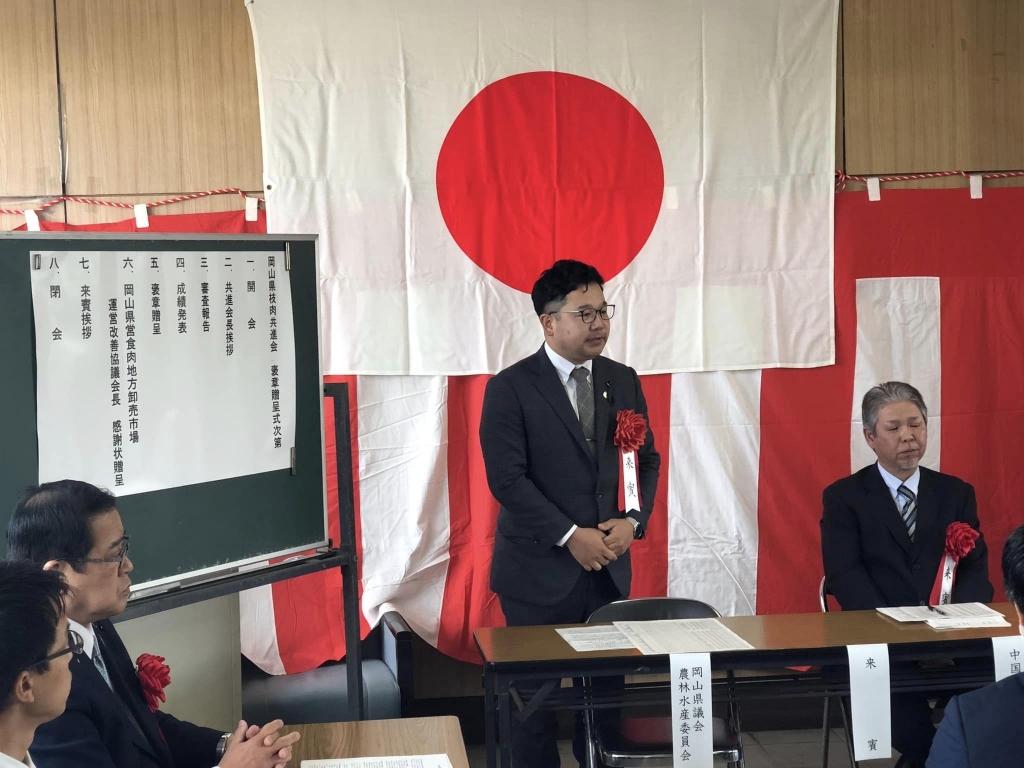 11時15分から開催された「第62回岡山県枝肉共進会褒賞贈呈式」に、県議会畜産振興議員連盟会長として出席しました。おめでとうございました。和牛、肉豚とも例年に増して、高品質でありました。