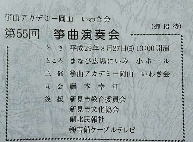 13時から「まなび広場にいみ」で開催された『筝曲アカデミー岡山・いわき会 第55回筝曲演奏会』に出席しました。毎年恒例の演奏会です。見事な演奏でした。ありがとうございました。