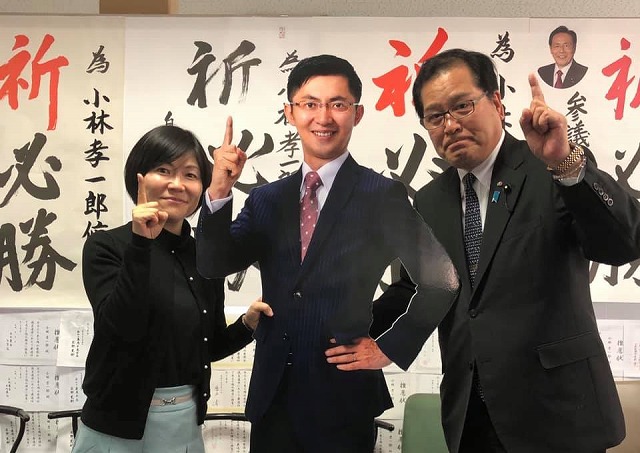 岡山県議会議員選挙に3期目の再選を目指して立候補を予定している自由民主党公認候補の小林孝一郎県議の事務所を激励訪問しました。同期の小林浩一郎県議の等身大パネルを囲んで、奥様と頑張ろう!