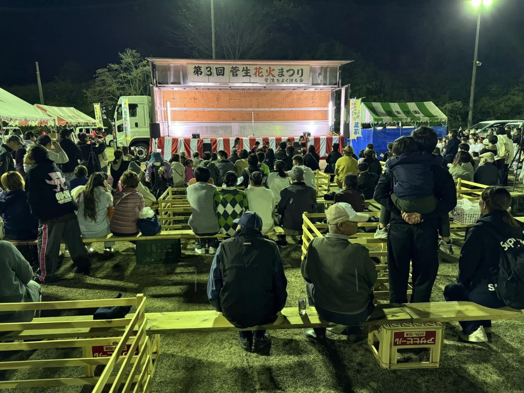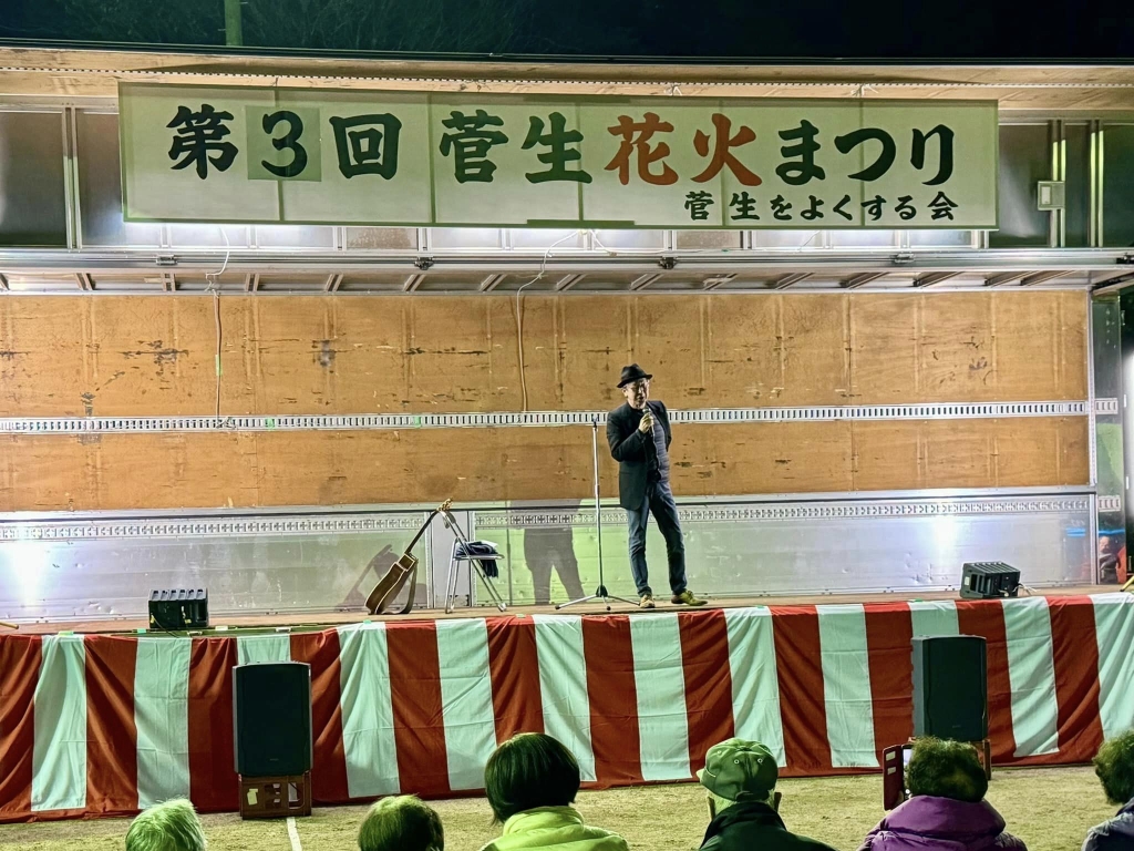 菅生地区に来ています。18時から、「第3回菅生花火まつり」が開催されました。ご開催おめでとうございました。お祝いのご挨拶の機会を頂きました。ありがとうございます。寒いので、屋外ストーブの用意がしてあります。素晴らしい。「おかやま元気!集落・菅生」、頑張ってます。おお!松原徹先生の登場~♬
