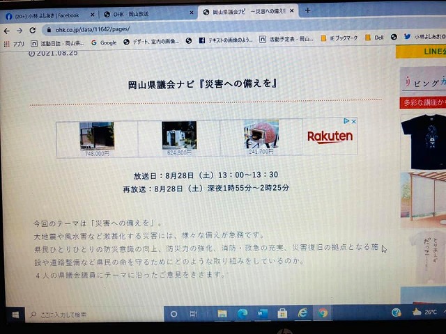 OHK岡山放送のホームページで、TV収録番組『岡山県議会ナビ~防災への備えを~」の紹介がされている。ご都合がよろしければご覧ください。出演させて頂いてます。