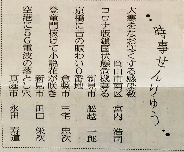 山陽新聞「時事せんりゅう」。同級生田口栄次くん、166回目です。