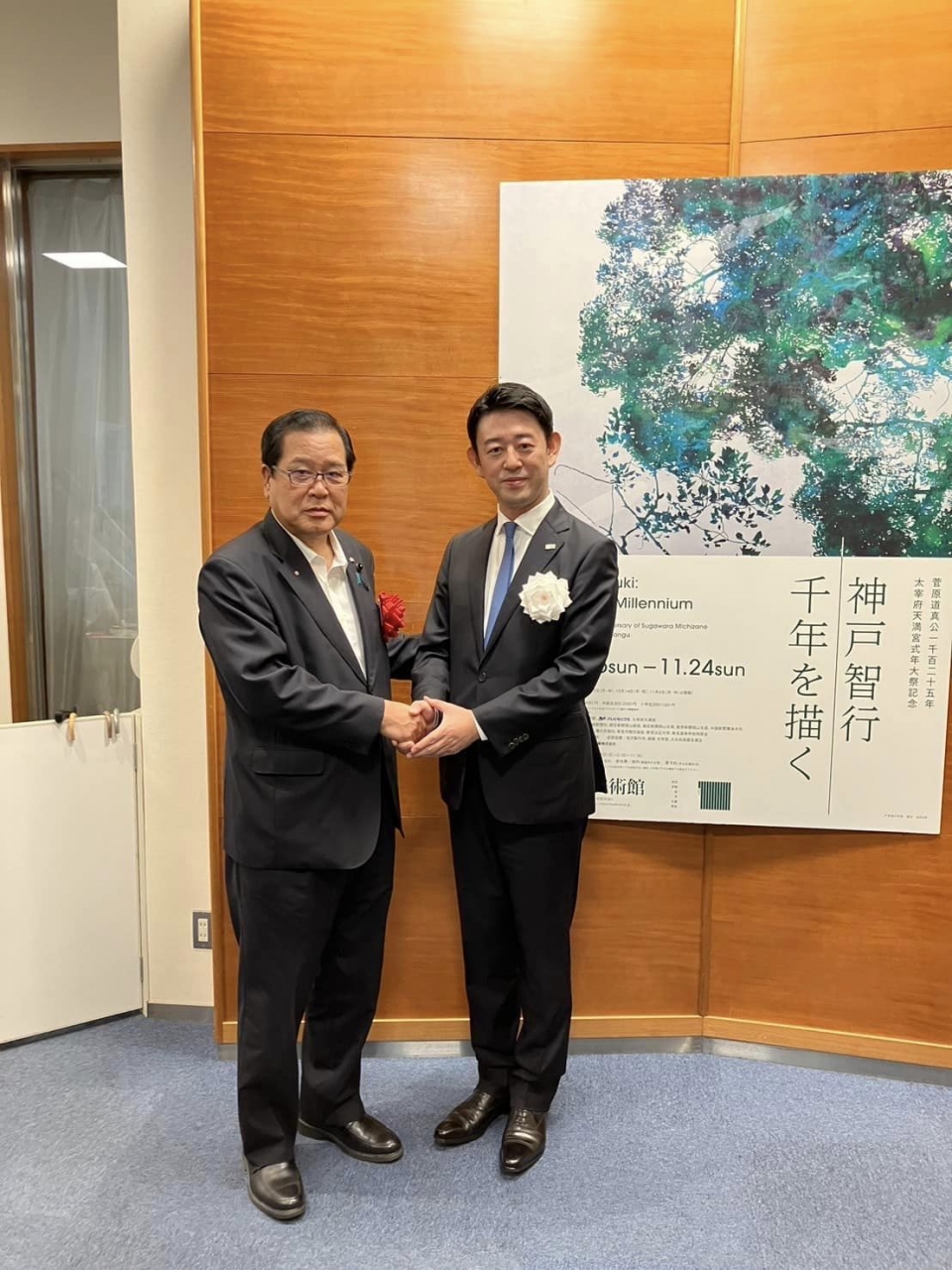 新見美術館で本日開幕した「菅原道真公一千百二十五年大宰府式年大祭記念~神戸智行千年を描く~展」に、菅原道真公直系で、太宰府天満宮第40代宮司の西高辻信宏先生と、「これもご縁ですね」と昔話をさせて頂いた。