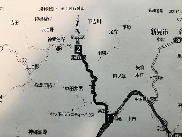 本日14日6時、新見日南線「新見市神郷下神代~新見市足立3700m」「新見市足立~新見市神郷釜村5900m」が、基準雨量に達した為、全面通行禁止となりました。ご注意ください。