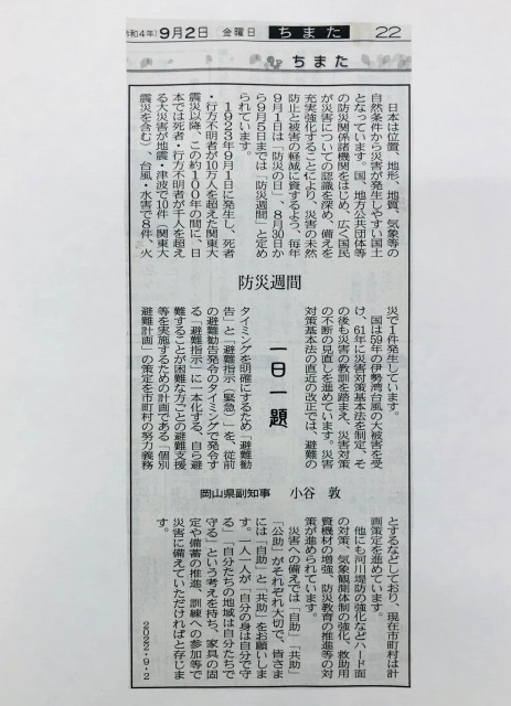 県議会棟に入りました。今日から、「9月定例岡山県議会」が始まります。記事は、9月2日の山陽新聞「ちまた」欄です。