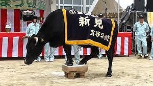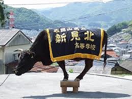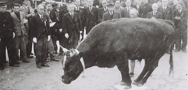 新見市が誇る「千屋牛(ちやぎゅう)」。現在もその調教技術のシンボルとして引き継がれる「千屋牛の碁盤乗り」を、昭和天皇陛下にご視察頂いたと聞いた。その時の写真です。何年頃なんだろう。