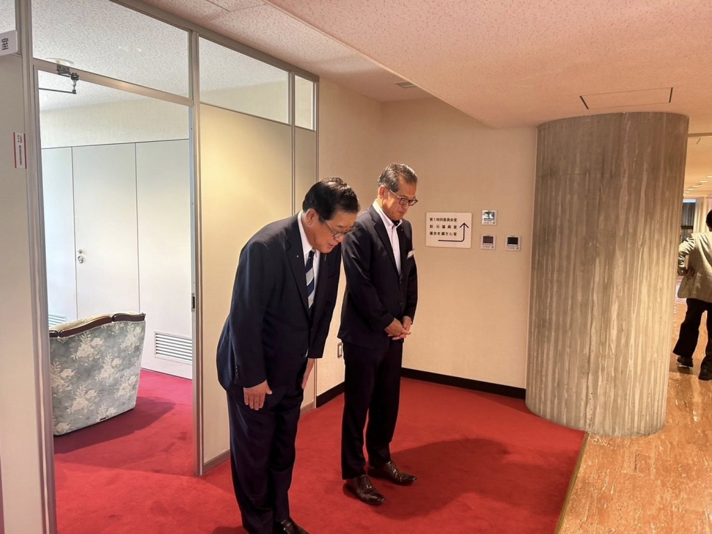 岡山県議会では、本会議の10分前から、議事堂入り口で、議長職を務める者(議長または副議長)と県議会事務局長が立礼で県議の皆さんをお出迎えします。伝統儀礼です。