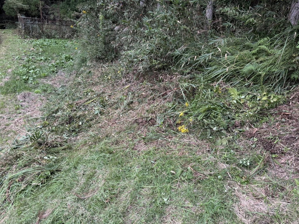 帰宅して、15時頃から「草刈り」。笹とつる草に四苦八苦。少しだけ押し戻せた。