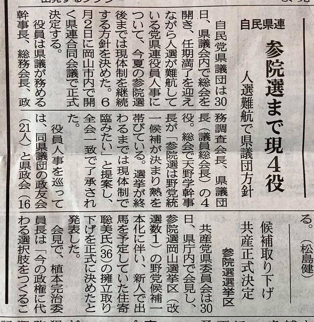 昨日の自民党岡山県議団総会の様子が報じられている。山陽新聞です。
