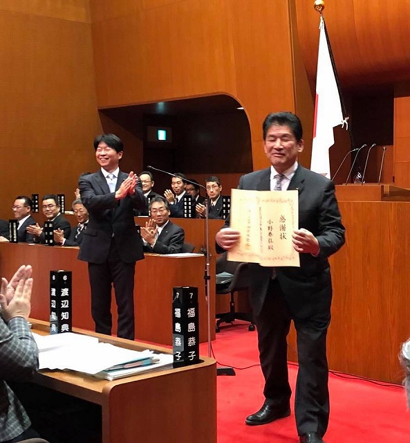散会後、永年勤続議員に対する知事感謝状の贈呈。小野先生、勤続20年、おめでとうございます。