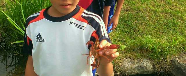 「あのなぁ、あのなぁ、ザリガニをなぁ、つかまえたん」