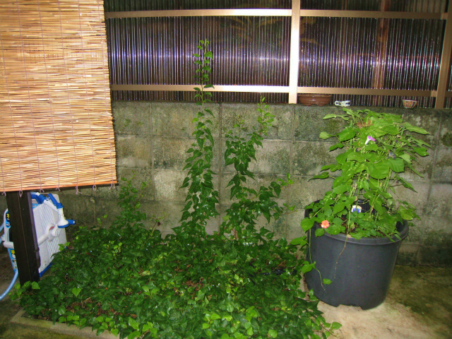 雨の裏庭、真っ直ぐのびる「ツタくん」であります。