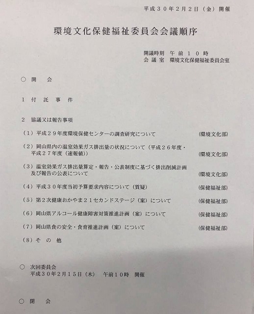 10時から、県議会『環境文化保健福祉委員会』開会。