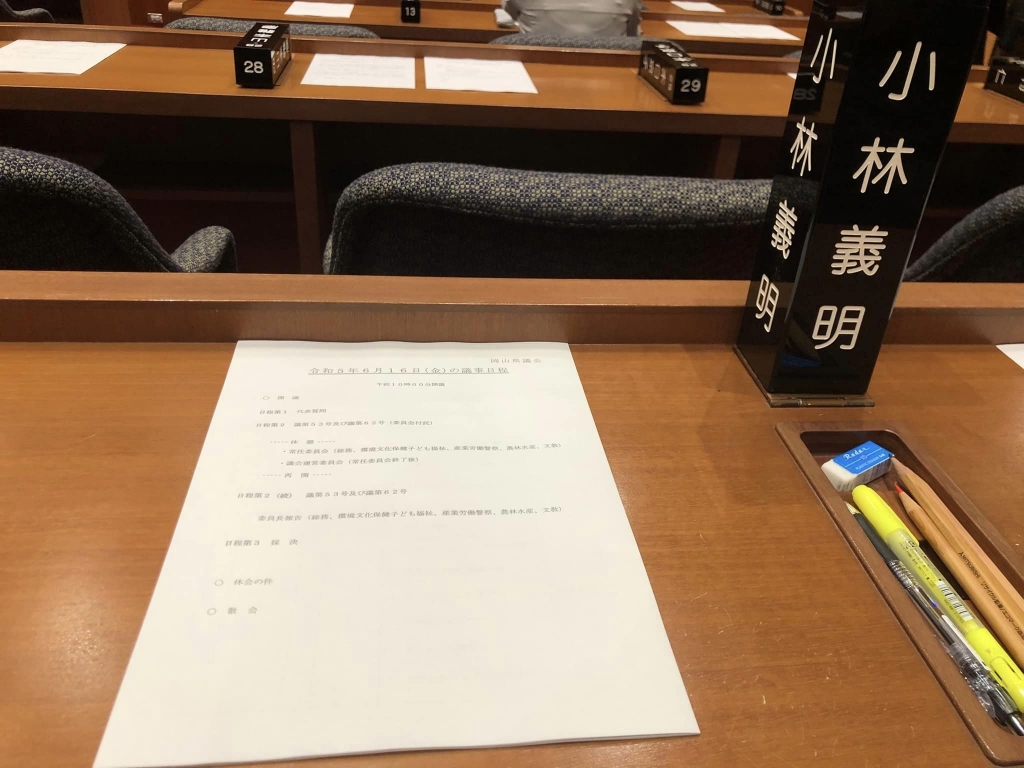 10時から、「6月定例岡山県議会」再開。自民党、民県クラブ、公明党の代表質問が行われました。自民党代表質問者は、蓮岡靖之政務調査会長。