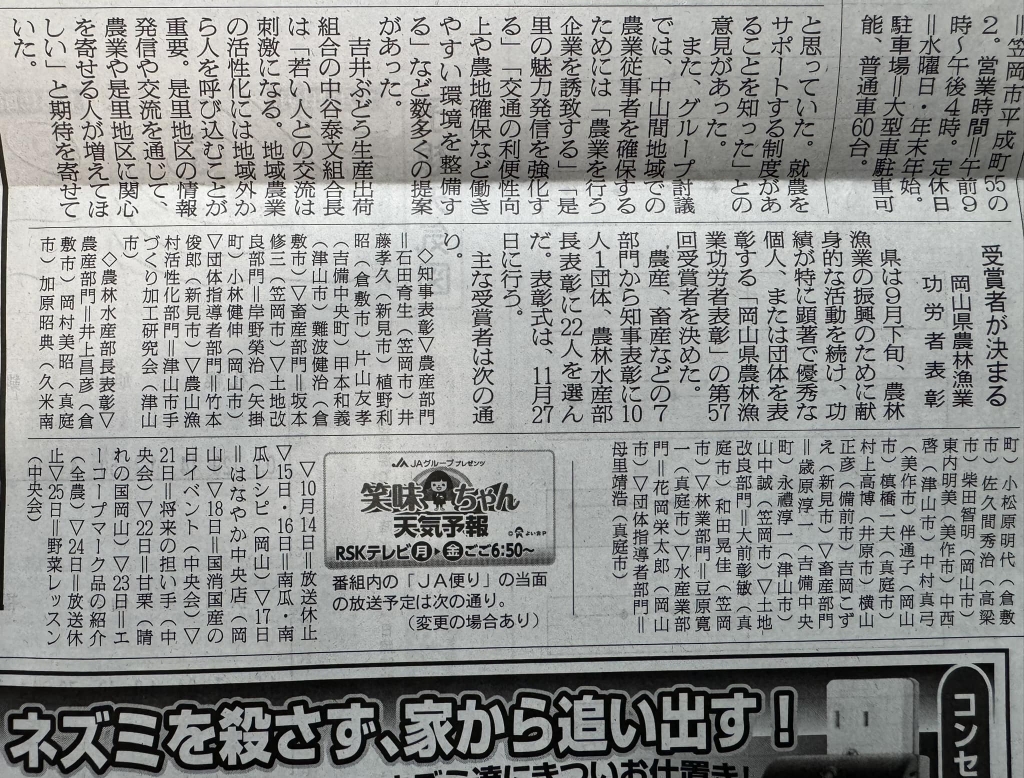受賞者が決定したとの記事は、「日本農業新聞」です。