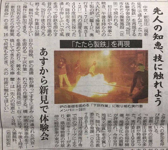新見へ帰って、『たたら製鉄体験学習』が行われている「たたら操業施設」へ激励に伺いました。新見の知的財産です。3年連続で銑鉄をを作ることに成功しています。頑張って。