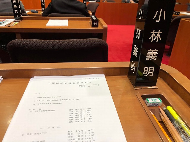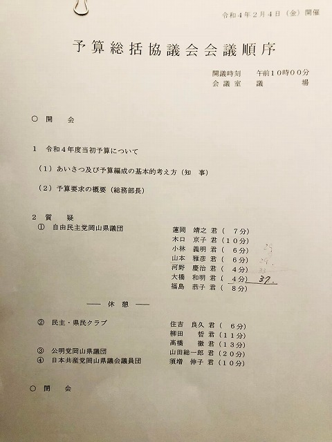今日は、岡山県議会「令和3年度予算総括協議会」が開催されました。私は自由民主党代表質問、環境文化保健福祉関係で部会長として登壇させて頂きました。ありがとうございました。昼休憩時間に「政友会」が開催されました。