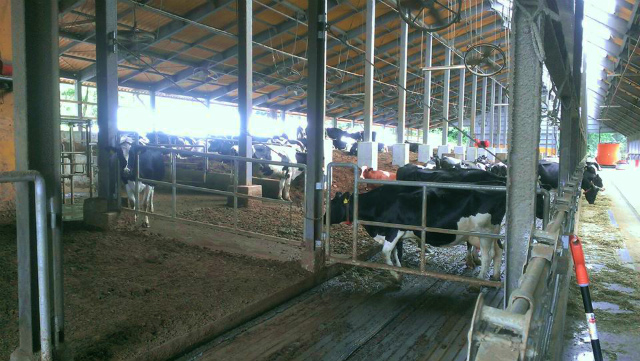 午前10時、県議会棟をバスで出発して、吉備中央町上竹の「雲岡牧場」を視察。乳牛の大規模経営施設。フリーバーン牛舎や約3000万円するという搾乳ロボットを見学しました。