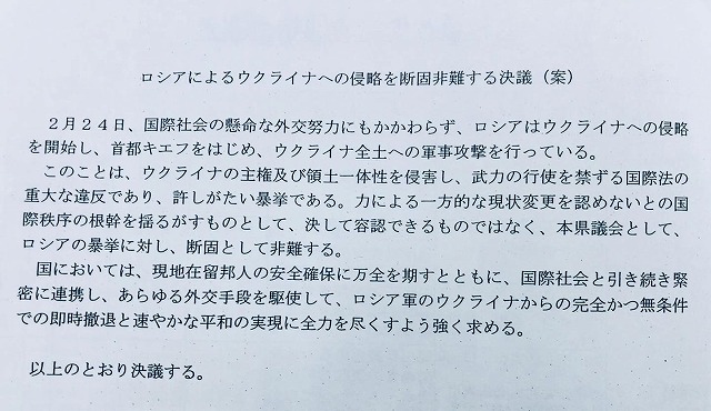 昨日の「2月定例岡山県議会」で、ロシアによるウクライナ侵攻を非難する決議案が、全会一致で可決されました。