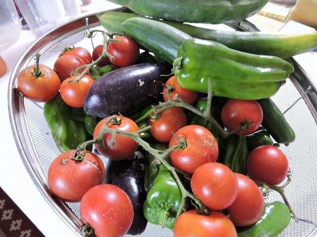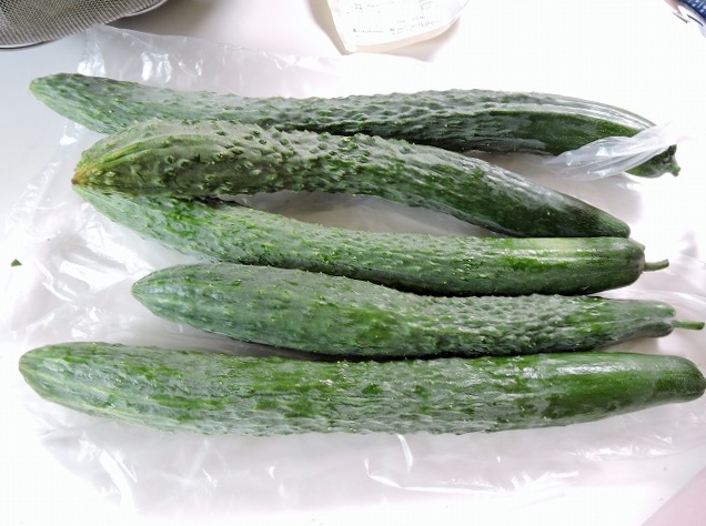 我が家の収穫と頂いたキュウリ5本。朝食はベジタリアンだなぁ。無農薬だからね。