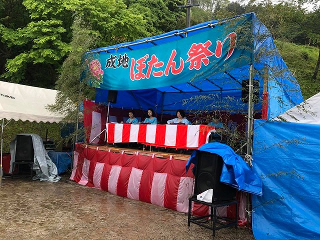 急いで新見へ帰って、11時から「成地牡丹園」で開催された『千屋成地ぼたん祭り』に5分遅れて出席しました。開会式で一言ご挨拶の機会を頂きました。ありがとうございました。あいにくの雨でしたが、盛大に開催されていました。