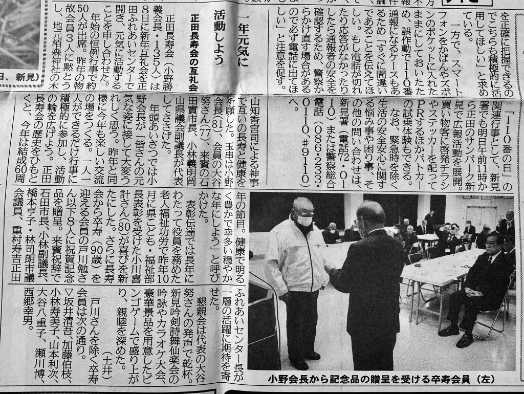 新見の地域紙から。昨日出席させて頂いた「正田長寿会新年互礼会」と、新見市文化協会元会長杉井幸正氏の記事です。