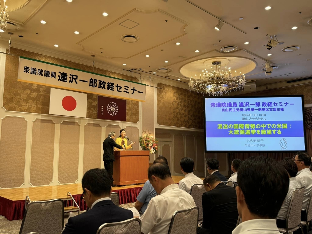 急いで岡山市へ移動して、岡山市議会議員さんの事務所で30分ほど会談。ありがとうございました。それから、岡山市内のホテルで、13時30分から開催された「衆議院議員逢沢一郎政経セミナー」に出席しました。会場いっぱいの皆様がご出席でした。講師は、早稲田大学教授の中林美恵子先生でした。中林先生の基調講演の後、逢沢先生とのトークセッション。