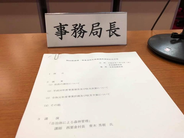 11時45分から、『岡山県森林・林業活性化促進議員連盟令和元年度総会』を開催しまた。引き続き事務局長を務めさせて頂きます。よろしくお願いします。総会行事の後、西粟倉村の青木秀樹村長に「自治体による森林管理について」と題してご講演頂きました。ありがとうございました。
