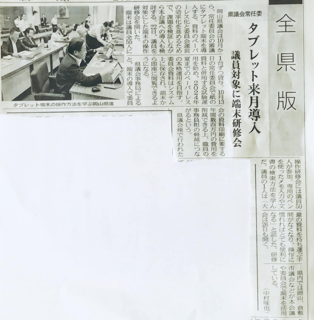 記事は、昨日の県議会「ペーパレス研修会」の様子です。山陽新聞です。