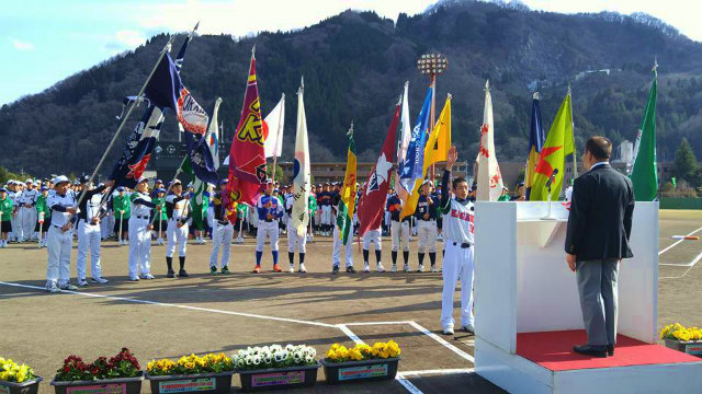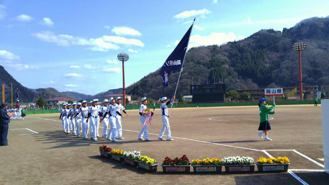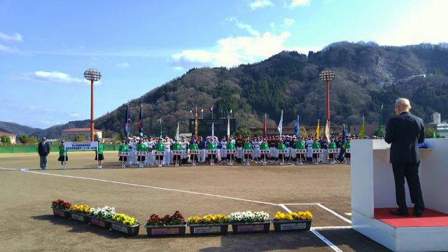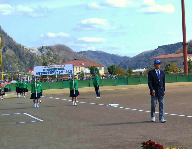15時から、「新見ピオーネ球場」で開催された『第12回都道府県対抗全日本中学生男子ソフトボール大会』の開会式に出席しました。晴天です。選手の皆さん頑張ってください。
