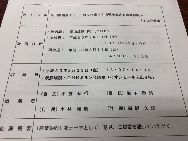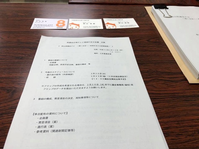 続いて、13時から「県議会広報テレビ番組打合せ会議」に出席。よろしくお願いします。
