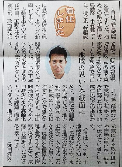 山陽新聞新見支局長として、赤磐市出身の苅田さんが着任された。県庁記者クラブで県政を担当されたいてので、何度かお話をさせて頂いたことがある。昨日支局へご挨拶に行かせて頂いた。