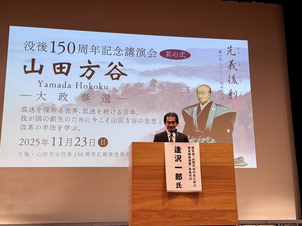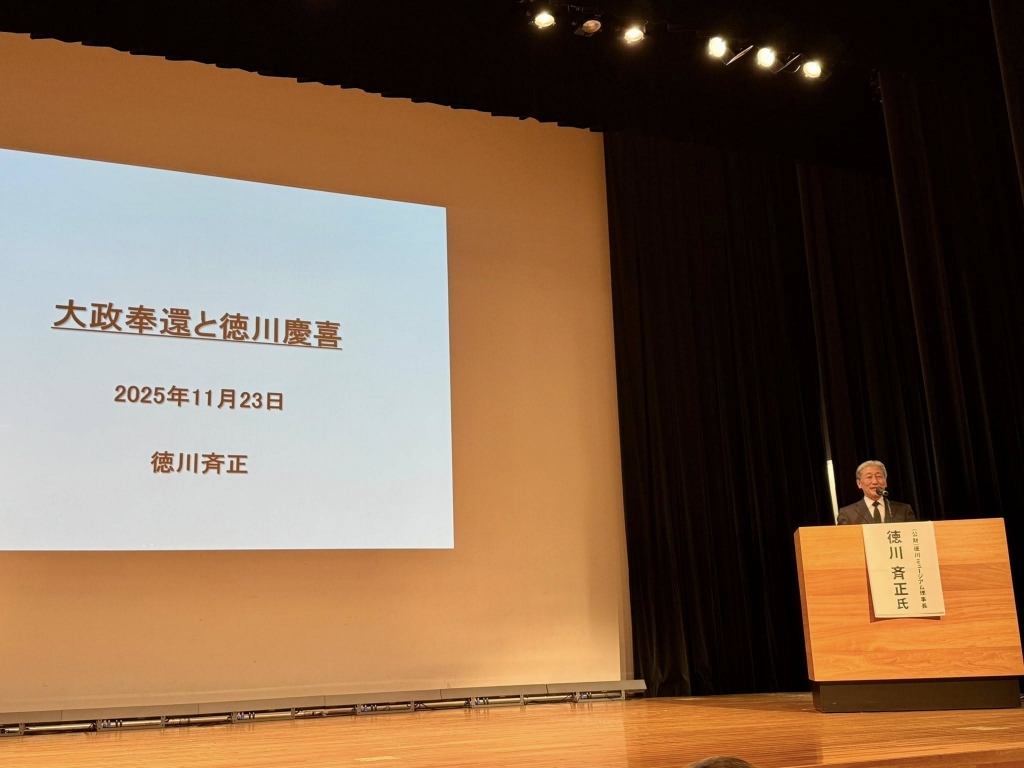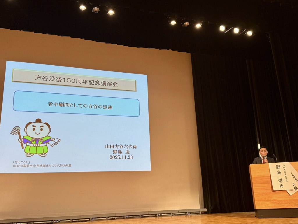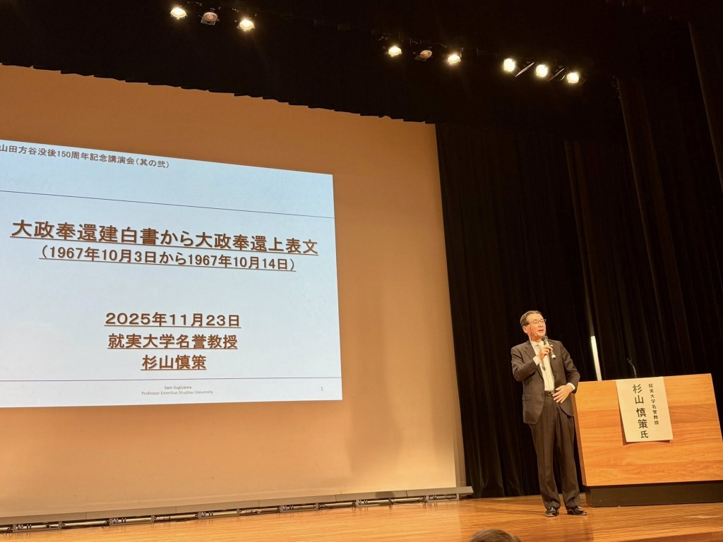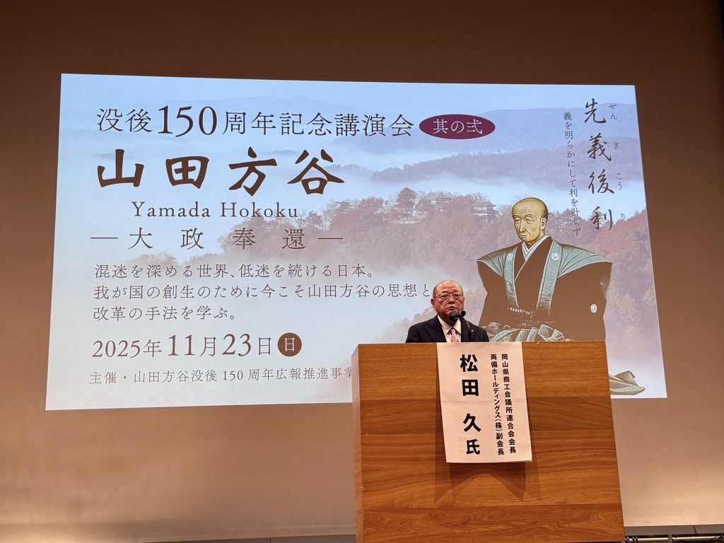 急いで岡山市へ移動して、13時から「山陽新聞さん太ホール」で開催された『山田方谷没後150周年記念講演会』に出席しました。開会行事に続いて、江戸幕府15代将軍徳川慶喜の曾孫、徳川斉正氏が「大政奉還と徳川慶喜」と題して、山田方谷直系子孫、野島透氏が「老中顧問としての方谷の足跡」と題し、就実大学名誉教授、杉山慎策氏が「大政奉還建白書から大政奉還上表文」と題して、それぞれ講演されました。
