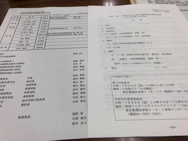 10時30分から、東京都内で開催された『森林・林業・林産業活性化促進地方議員連盟全国連絡会令和元年度第1回役員会』に出席しました。「森林を活かす都市の木造化推進」の考え方が示されました。なお、第2回役員会、令和元年度通常総会は、7月26日㈮に開催されることが決定されました。