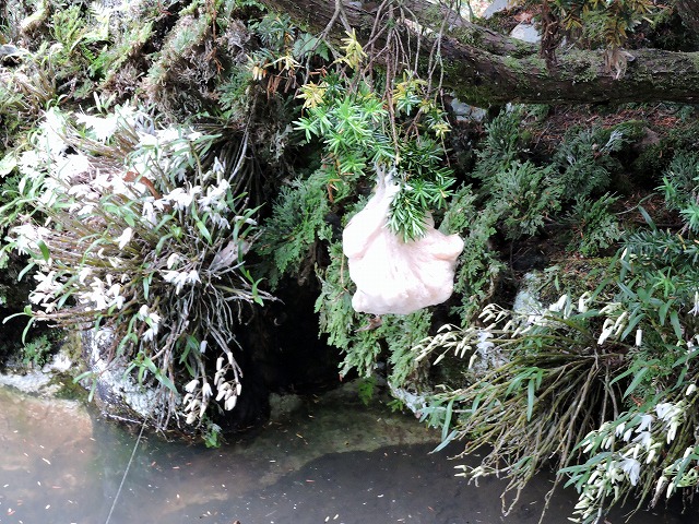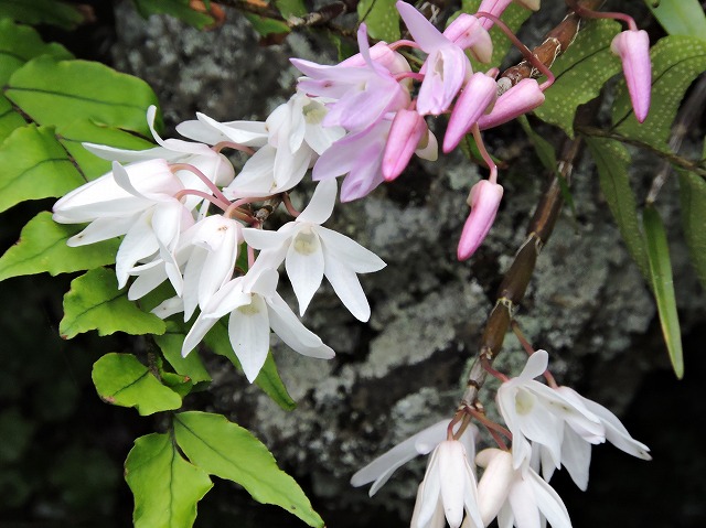 「朝のお散歩」日和。白と薄ピンクのセッコクとモリアオガエルの卵泡。本日もよろしくお願いします。頑張りましょう。