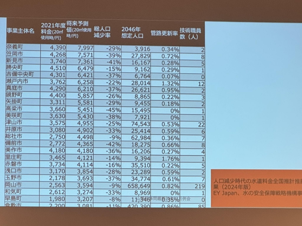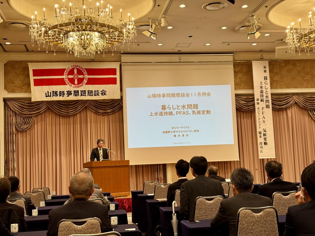 17時30分から、岡山市内のホテルで開催された「山陽時事問題懇談会」に出席しました。今宵の講師は、水ジャーナリストの橋本淳司氏。演題は「暮らしと水問題~上水道維持、PFAS、気候変動~」でした。もはや先送りできない問題、課題です。
